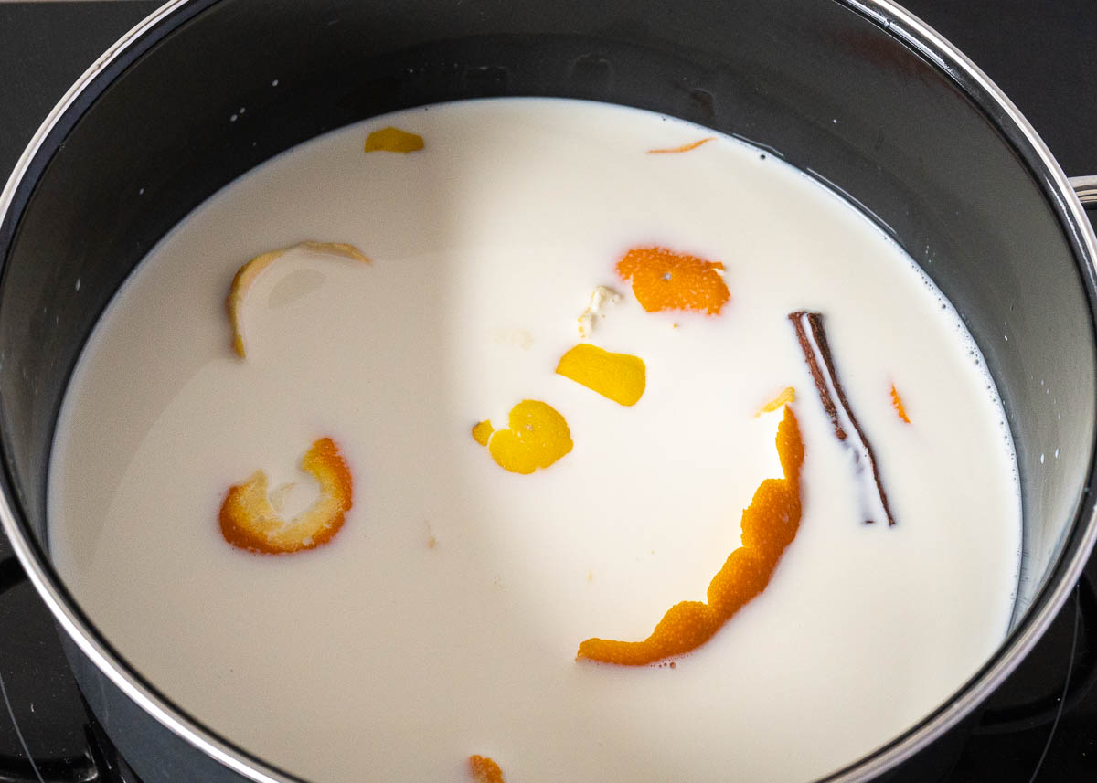 En un cazo u olla calentamos la leche con los 100 gramos de azúcar, la piel de naranja y limón y la ramita de canela en rama, dándole vueltas con una cuchara de madera para que se diluya el azúcar. Esta es la infusión más tradicional, pero podéis variarla a vuestro gusto, omitiendo alguno de los ingredientes o sustituyendo la canela por una vaina de vainilla.