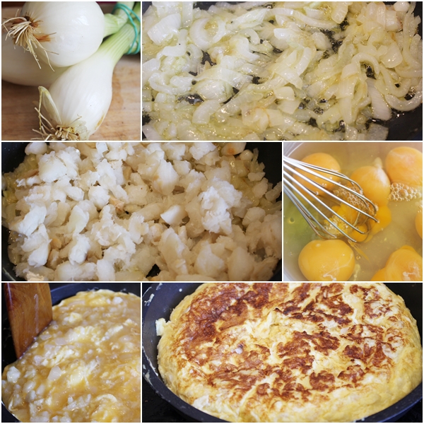 Se pocha a fuego muy lento cebolla y pimiento verde,hasta que este casi caramelizado..En un cazo con agua hirviendo,se escalda un trozo de bacalao previamente desalado.Se quitan las espinas que pueda haber y se sacan las láminas.Se mezcla todo ya fuera del fuego.Se añade a los huevos batidos y se echa un poco de perejil picado.