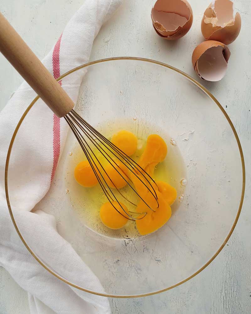 - En un bol amplio batimos los 6 huevos con un poco de sal