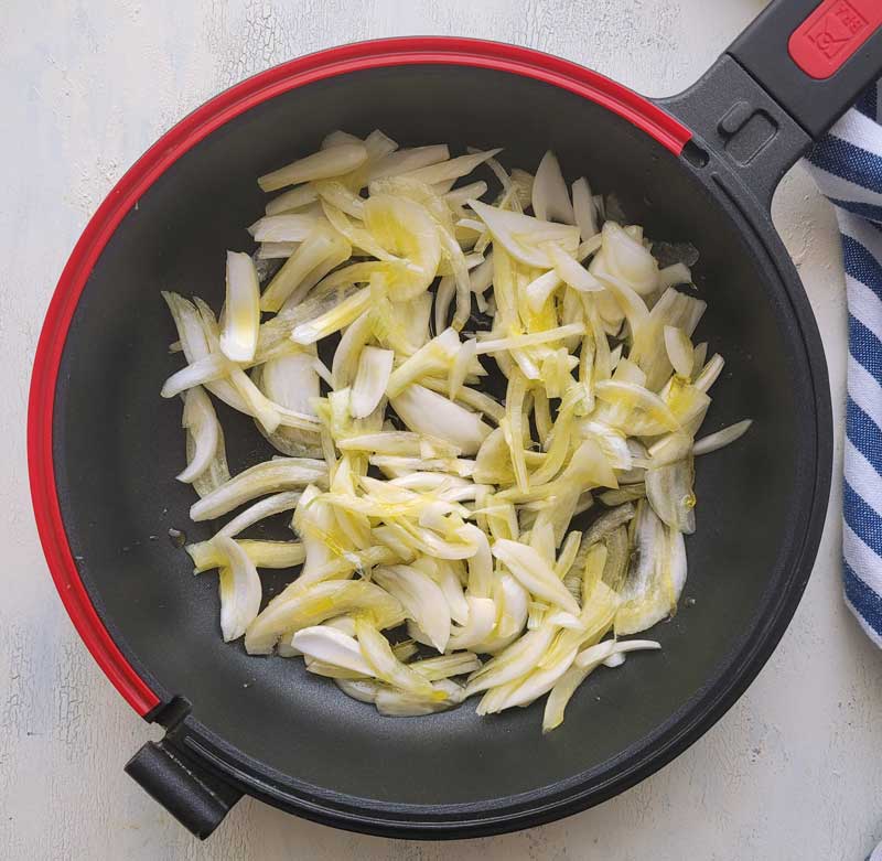 - Añadimos la cebolla y dejamos que se cocine a fuego bajo hasta que veamos que la cebolla se carameliza de forma natural con sus propios azúcares.