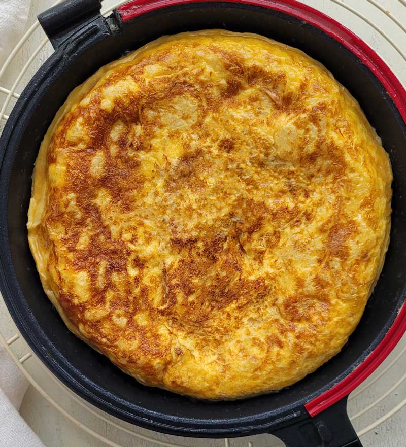 Ya os decíamos arriba que desde que tenemos la sartén doble para tortillas (que puedes comprar aquí), nuestro miedo para que ocurra cualquier accidente se ha reducido a cero. En caso de que no la tengáis solo tenéis que poner un plato que cubra bien la sartén (os aconsejamos uno lo más plano posible para que no se os deslice. Ponemos la mano plana sobre él, y con un movimiento rápido giramos la sartén sobre el plato. Intentad no parar por el camino, debe ser un movimiento uniforme y rápido. Luego deslizamos con cuidado la tortilla de nuevo en la sartén ayudándonos con una paleta.