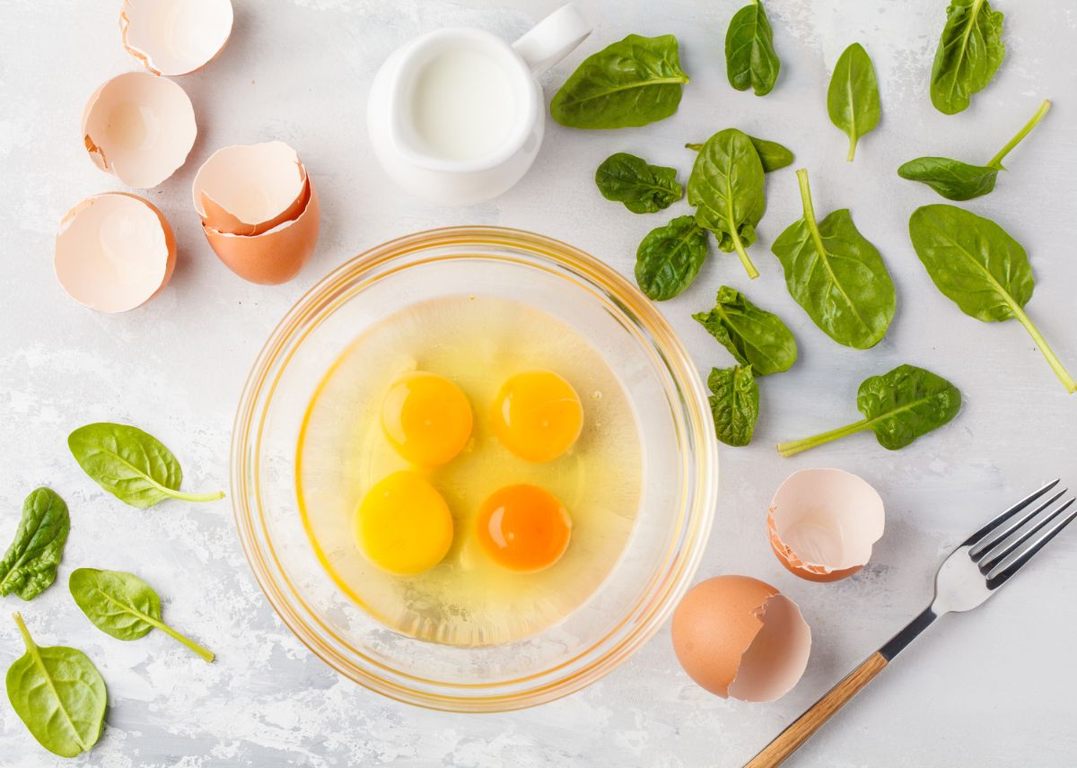 - Agrega las espinacas salteadas y el queso feta desmenuzado a los huevos batidos. Mezcla bien todos los ingredientes.
