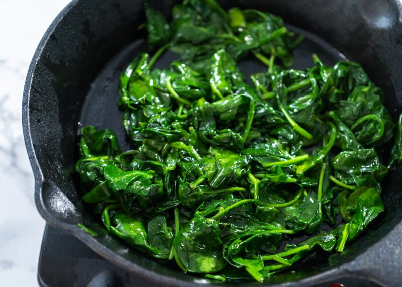 - En una sartén aparte, saltea las espinacas con un chorrito de aceite de oliva durante 3-4 minutos, hasta que reduzcan su tamaño. Sazona con una pizca de sal y pimienta.