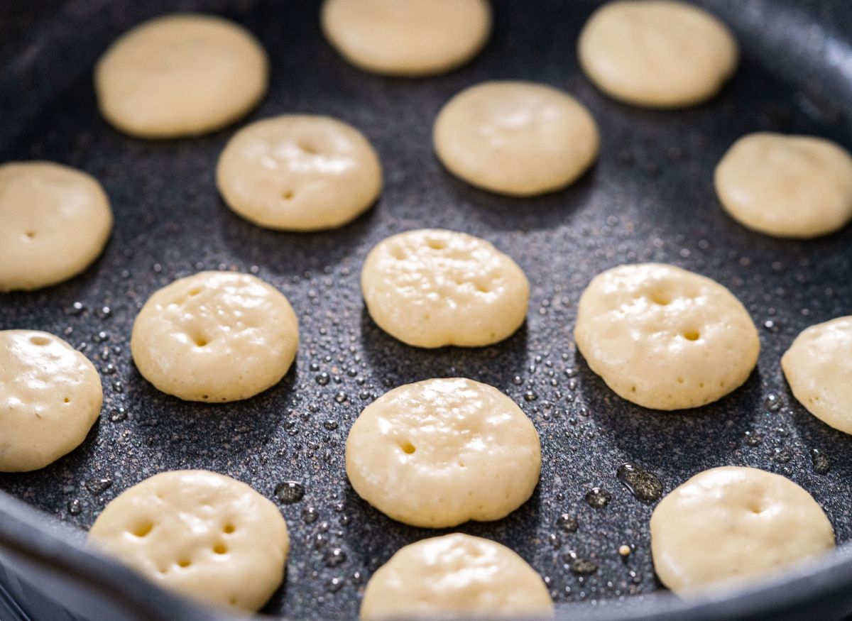 - Vierte pequeñas porciones de masa en la sartén y cocínalas a fuego medio hasta que estén doradas por ambos lados.
