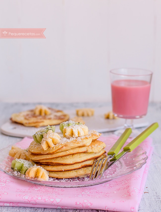 Decoramos las tortitas con un poquito de coco rallado y fruta. Si quieres probar la receta de tortitas americanas tradicional puedes ver esta receta en vídeo: