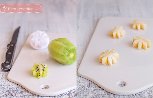 - Pelamos la fruta y cortamos con un cortador en forma de flor o con el motivo que más os guste.