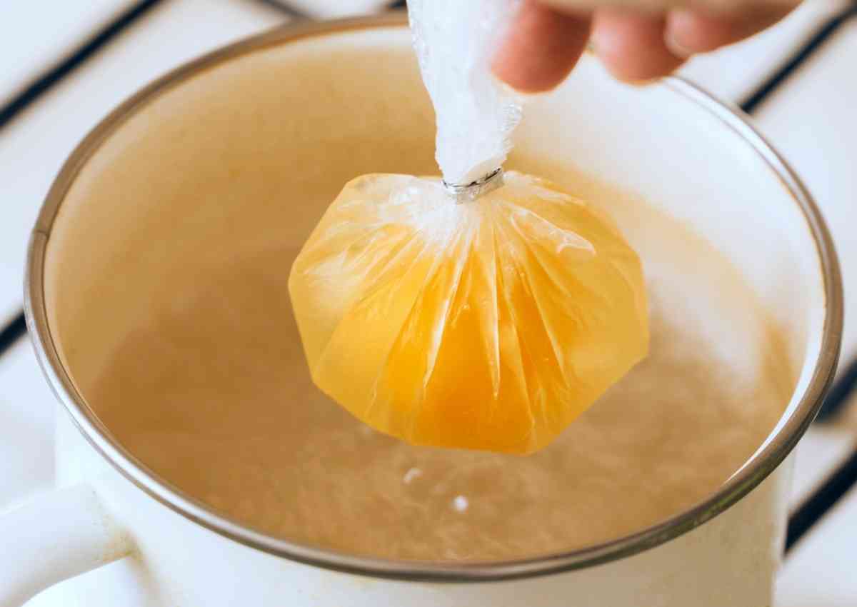 - Usa un hilo de cocina o una liga para atar y sellar el papel film, asegurándote de que el huevo esté completamente sellado dentro del film y que no haya aire atrapado.