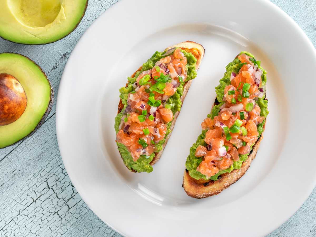 Ingredientes: 4 rebanadas de pan integral o de tu elección (centeno, artesanal, etc.); 2 aguacates maduros; 200 g de salmón ahumado, picado; 1/4 de cebolla roja, finamente picada; Cebollino fresco, picado al gusto; Jugo de limón (para evitar que el aguacate se oxide); Sal y pimienta negra al gusto.