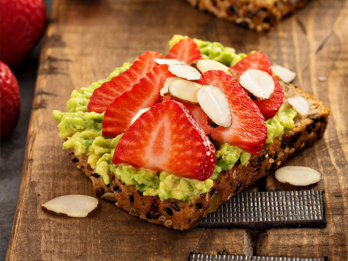Tostadas de aguacate con fresas y almendras laminadas
