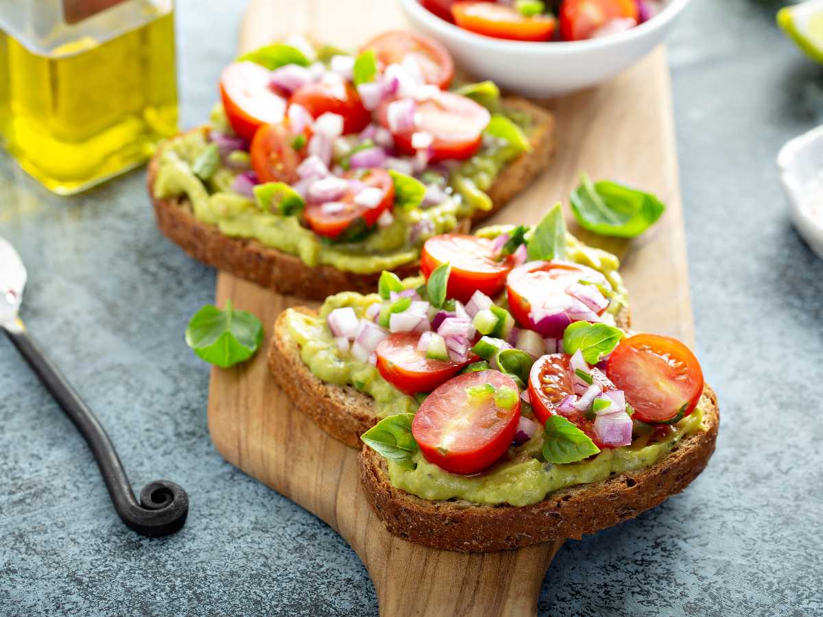 Ingredientes: 4 rebanadas de pan de tu elección (integral, de centeno, artesanal, etc.); 2 aguacates maduros; 1/2 taza de tomates cherry, cortados por la mitad; 1/4 de cebolla roja, cortada en cubitos pequeños; 1/2 pepino, pelado y cortado en cubitos; Jugo de limón (para evitar que el aguacate se oxide); Sal y pimienta negra al gusto; Aceite de oliva (opcional); hojas de albahaca frescas (opcional)