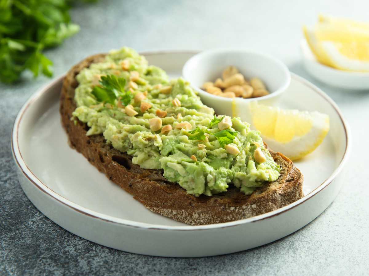 Ingredientes: Pan integral tostado; 1 aguacate maduro; Jugo de limón; Sal y pimienta al gusto; cacahuetes troceados