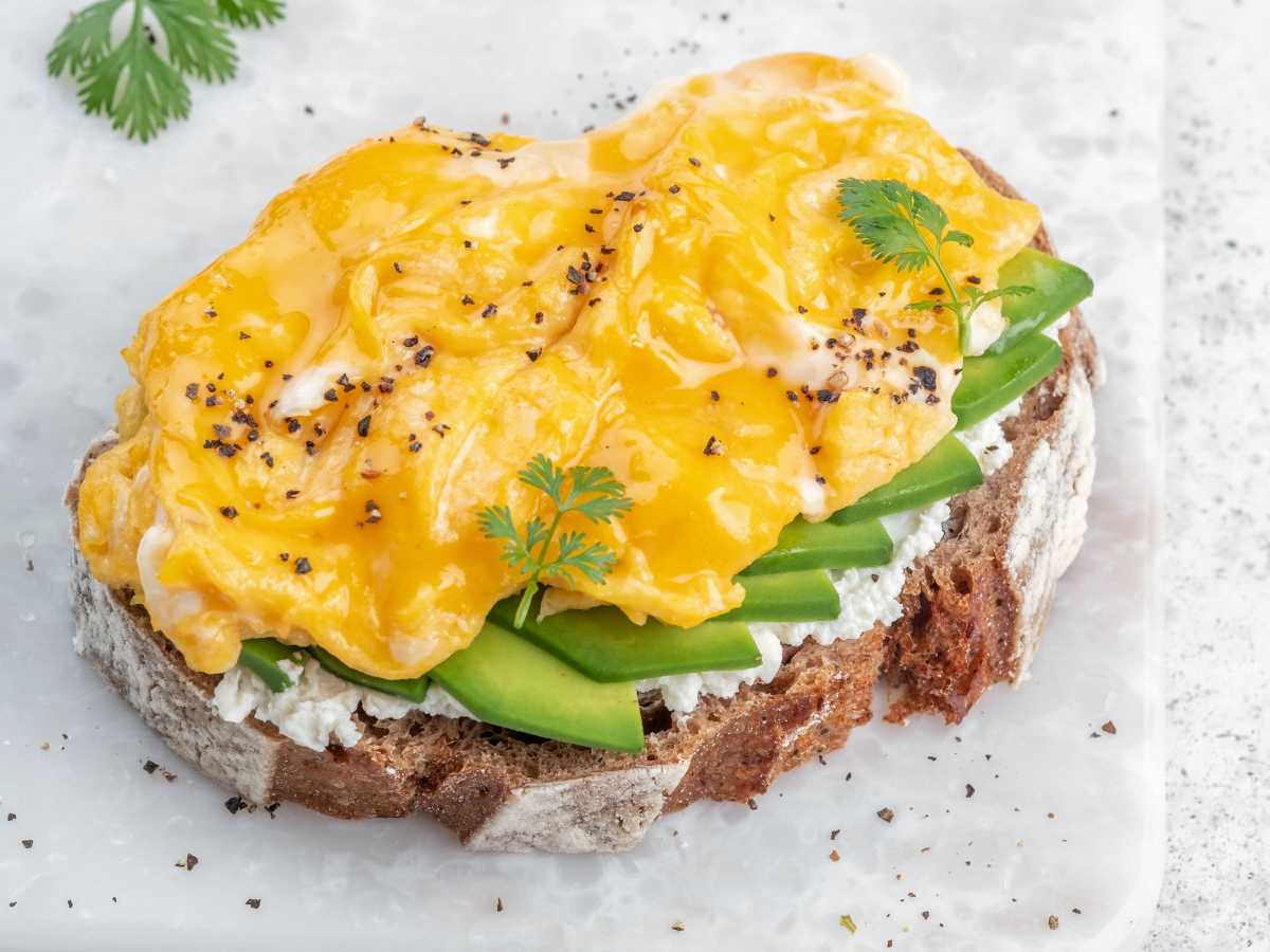 Tostadas de aguacate con queso crema y huevos revueltos