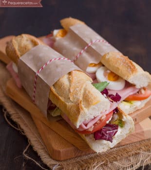 Ingredientes: Pan baguette; atún enlatado al natural; lechuga; rodajas de tomate; rodajas de cebolla; rodajas de huevo cocido; aceitunas verdes; mayonesa ligera; sal; pimienta.