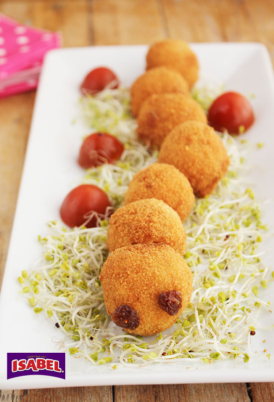 - Ponemos las bolitas una detrás de otra en línea y a la primera le ponemos con dos palillos un par de uvas pasas simulando los ojos. Para darle un poco más de “realismo” lo he rodeado de unos brotes, aunque podéis poner lechuga muy picada y unos tomatitos.