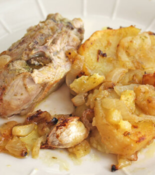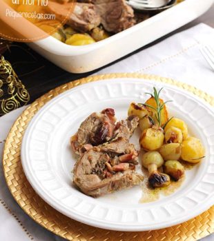 Pierna de cordero rellena al horno con patatas baby y cebollitas
