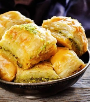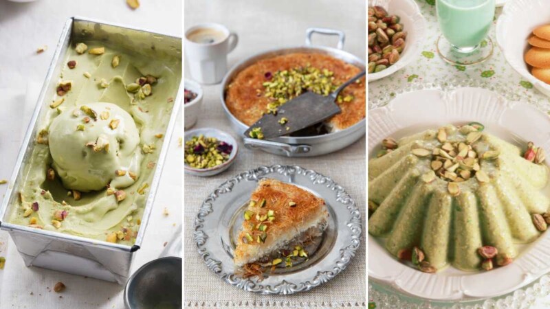 - Postres con pistachos: Si te gusta lo dulce, los pistachos pueden elevar tus postres. Úsalos para decorar tartas, helados o brownies. También puedes hacer un praliné de pistachos para usar como relleno en pasteles o magdalenas. Y si te apetece algo más tradicional, prueba hacer baklava, un postre típico de la cocina turca con masa filo y pistachos.