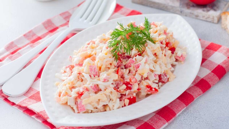 - Ensaladas frescas: Añade palitos de cangrejo a una ensalada de lechuga, aguacate y maíz para darle un toque suave y fresco. Su textura y sabor ligero los hacen ideales para ensaladas rápidas.
