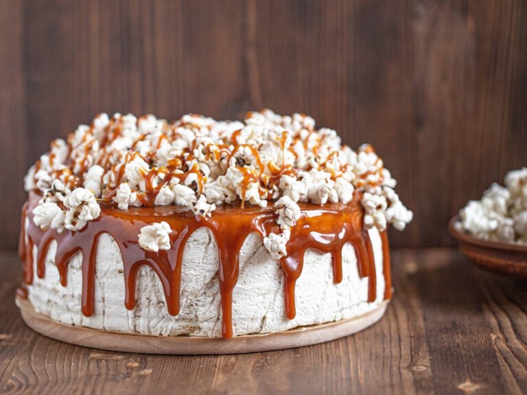 Tarta de miel en capas con palomitas y caramelo